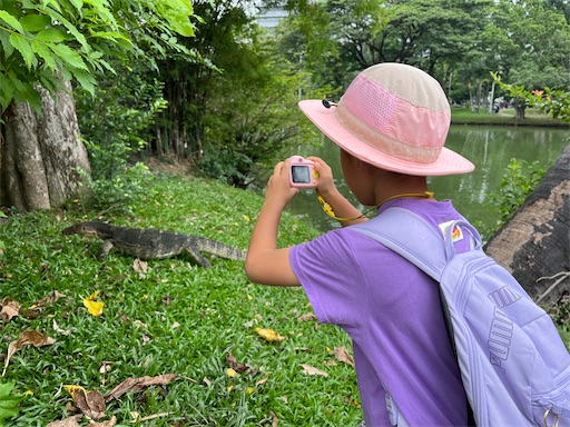 恐竜ハンターごっこをしながら公園内を散歩して